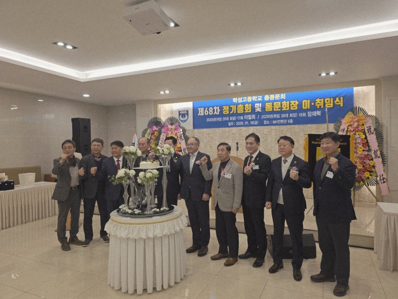 학성고등학교 총동문회 2026년 정기총회 및 회장 이·취임식이 지난 16일 MH컨벤션웨딩홀에서 열렸다. 장재혁 취임회장과 이철희 이임회장, 이성룡 울산시의회의장 등 내빈들이 축하 케이크를 자르고 있다.